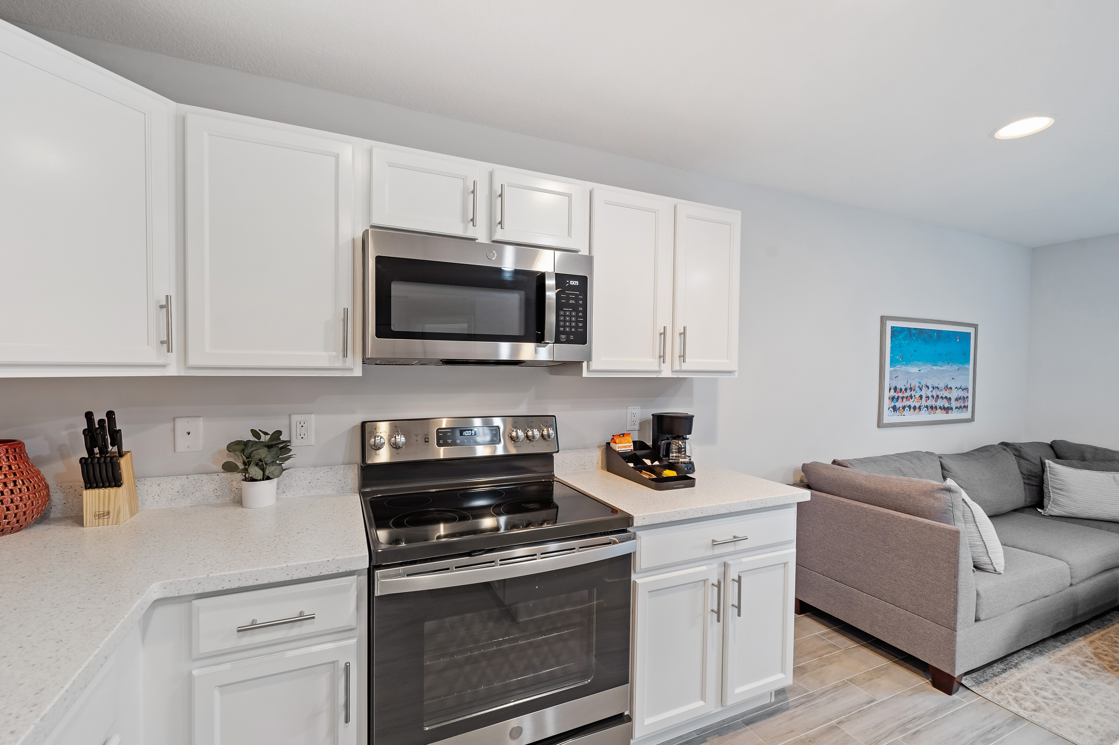 KITCHEN: The kitchen features a spacious refrigerator, oven, microwave, dishwasher, electric stove.