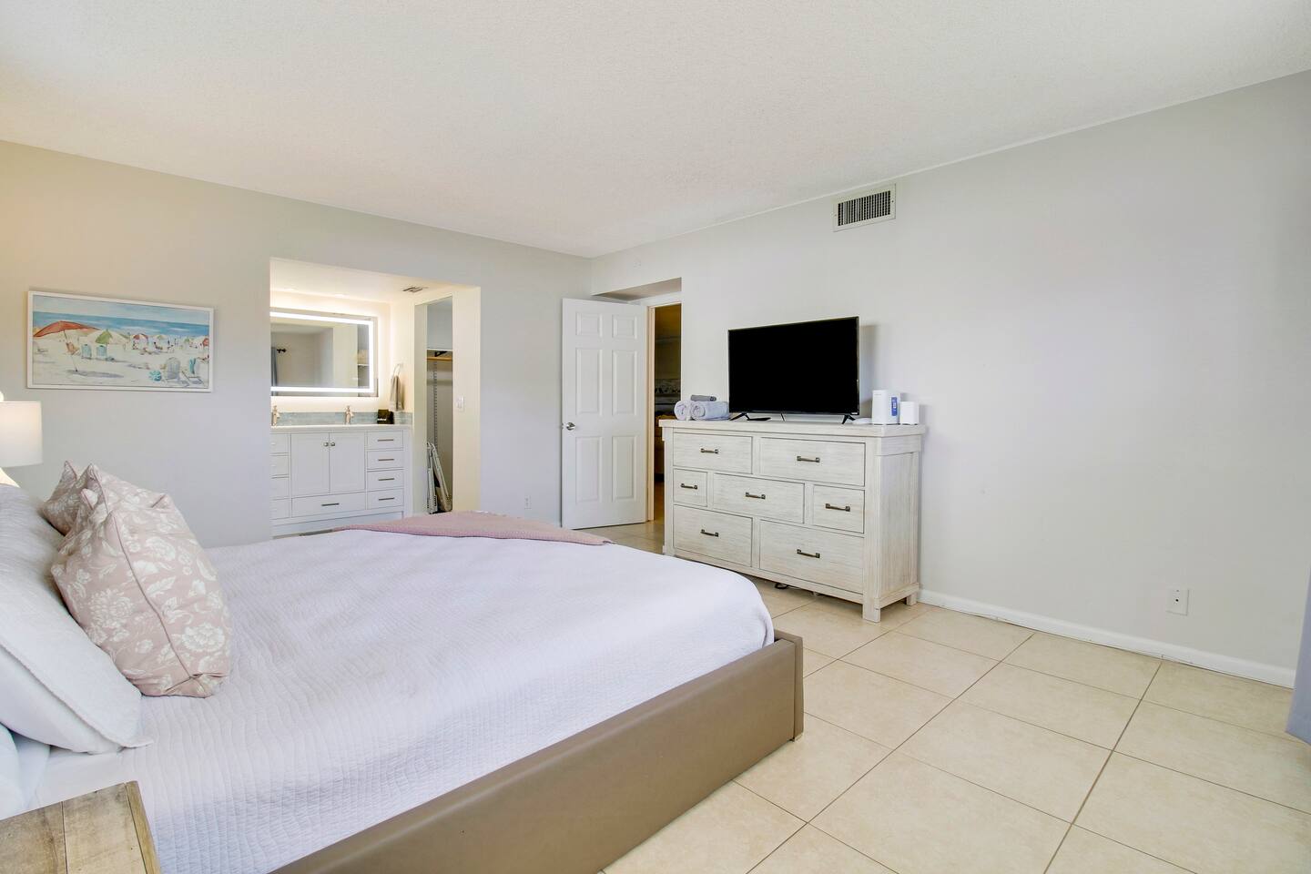 MASTER BEDROOM: Features a king bed with cottons sheets, classic coastal style furniture, an ensuite bathroom with a shower, and a smart TV to connect all your streaming services to watch your favorites.