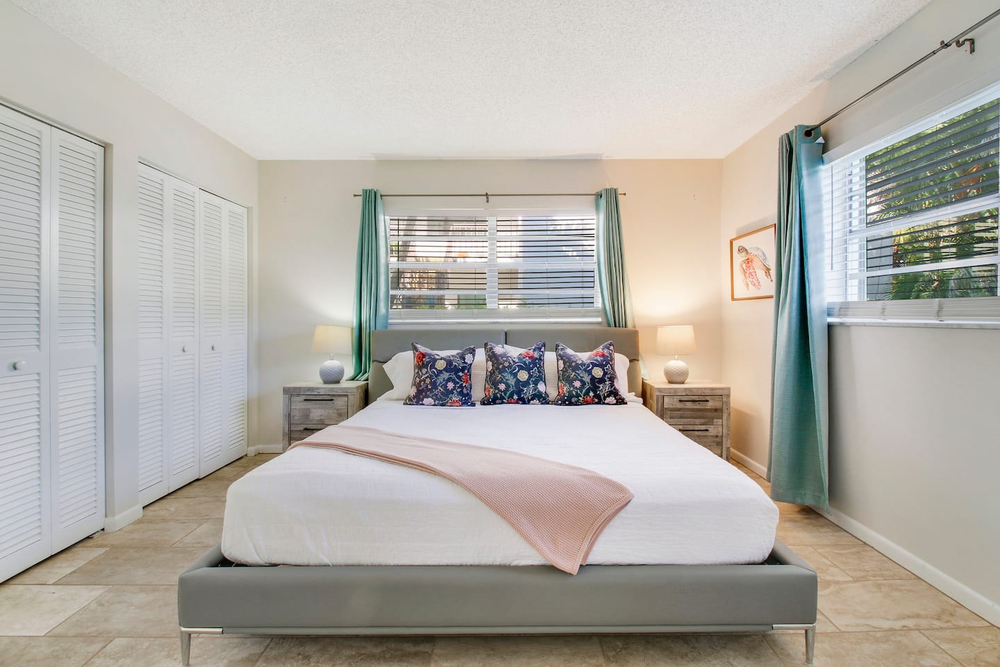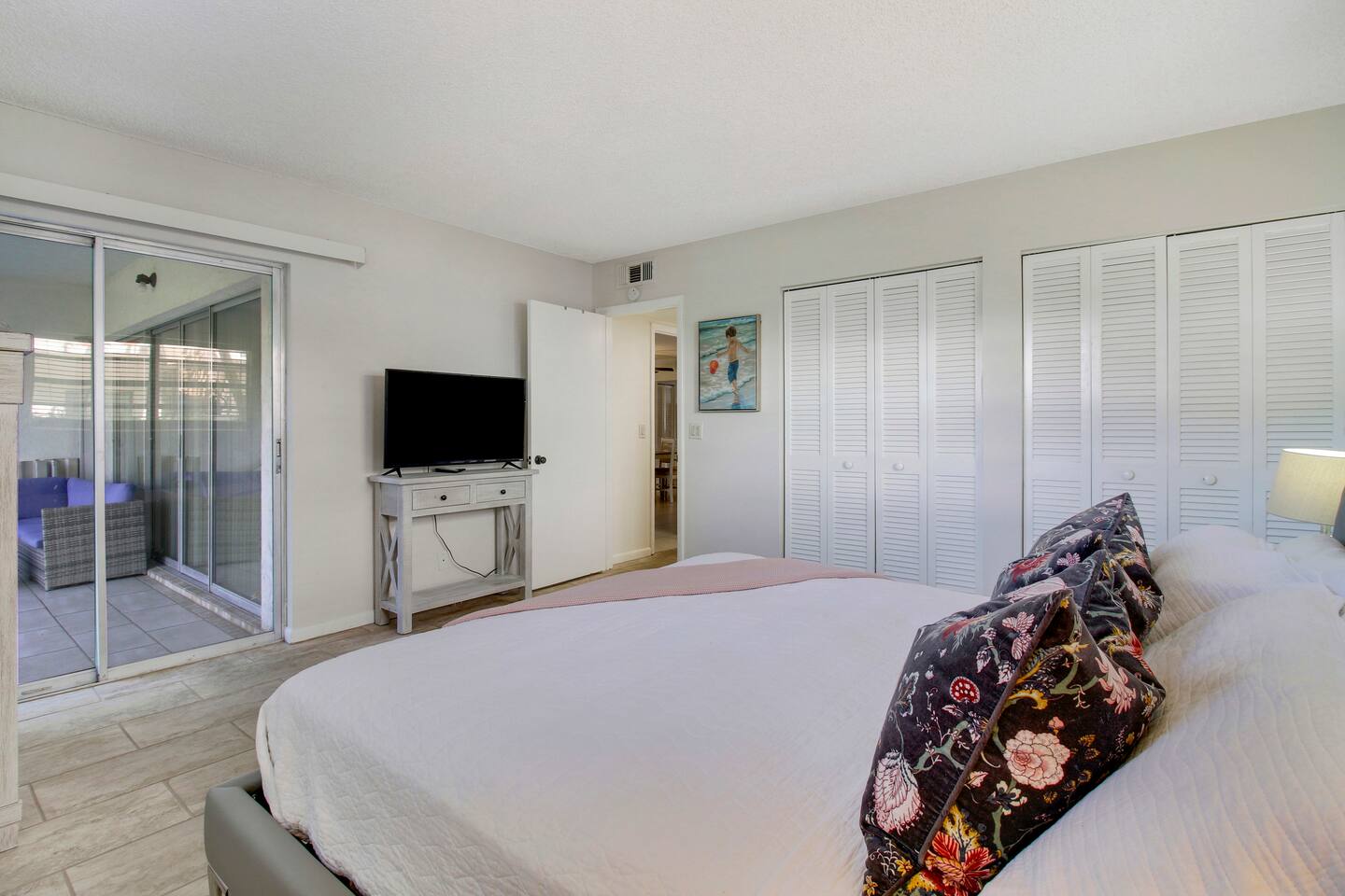 SECOND ROOM: Features a King Bed with cotton sheets and sliding doors for direct access to the screened in patio.