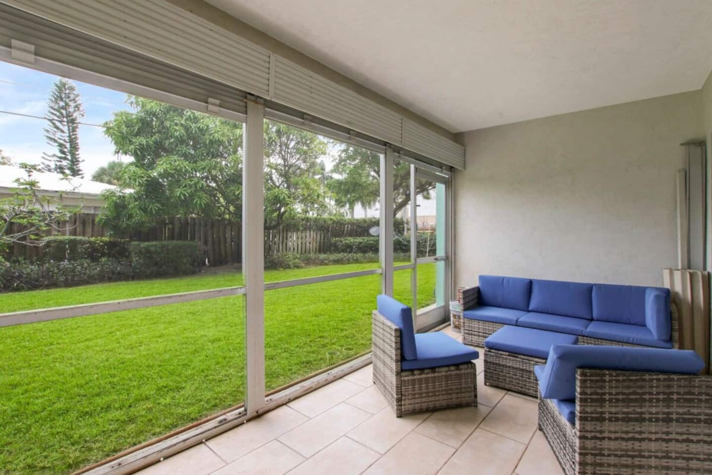BACKYARD: is not fenced-in, but we do provide a leash tied down by the back patio door to let the pup out to roam. With luscious greenery, a mango and fig tree in the back, you can soak up some fresh air on the screened in patio.