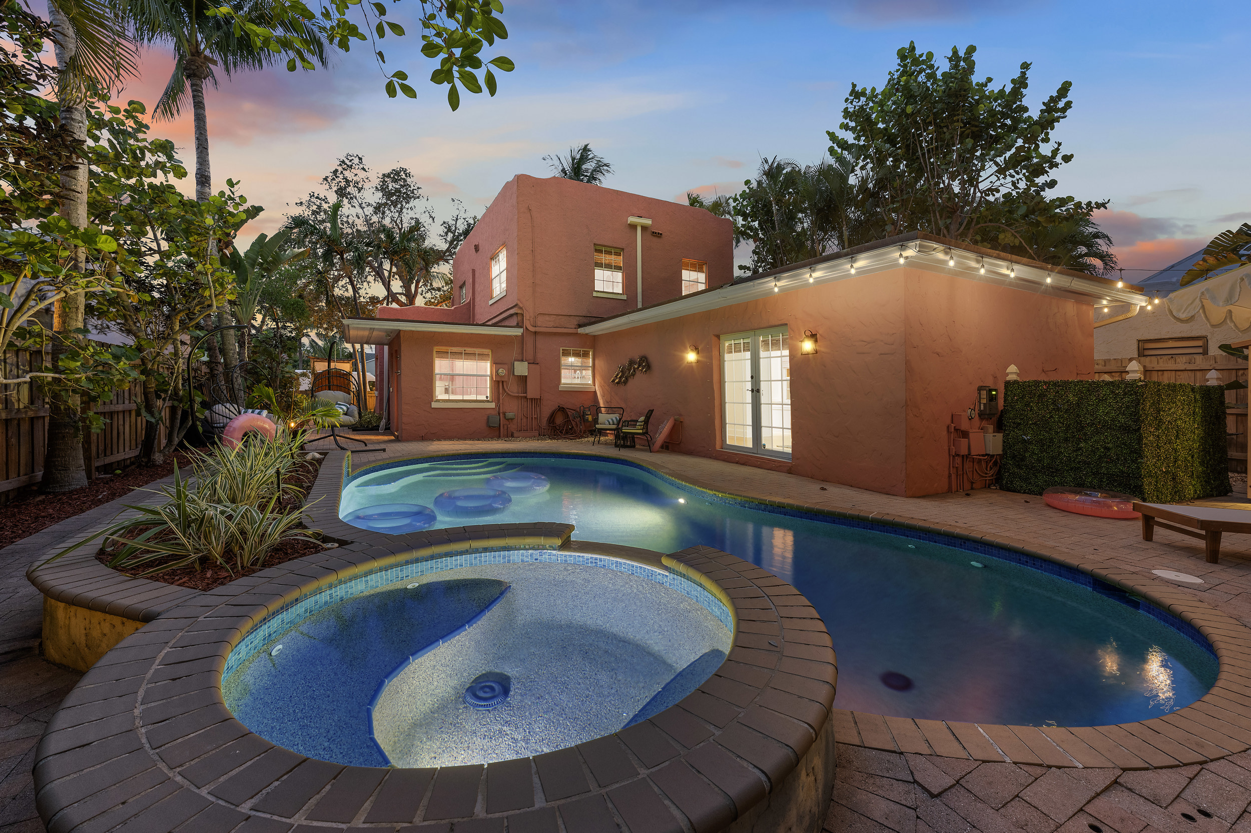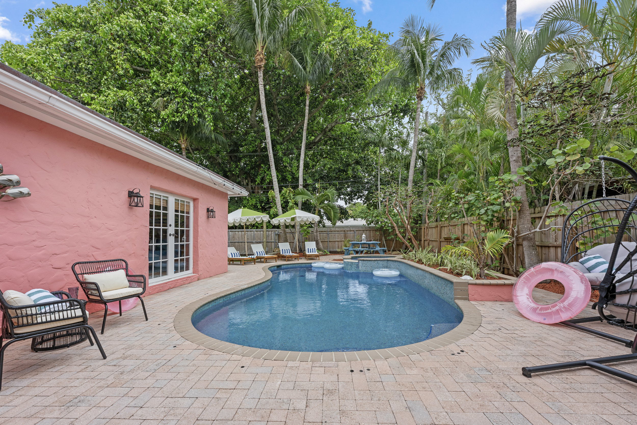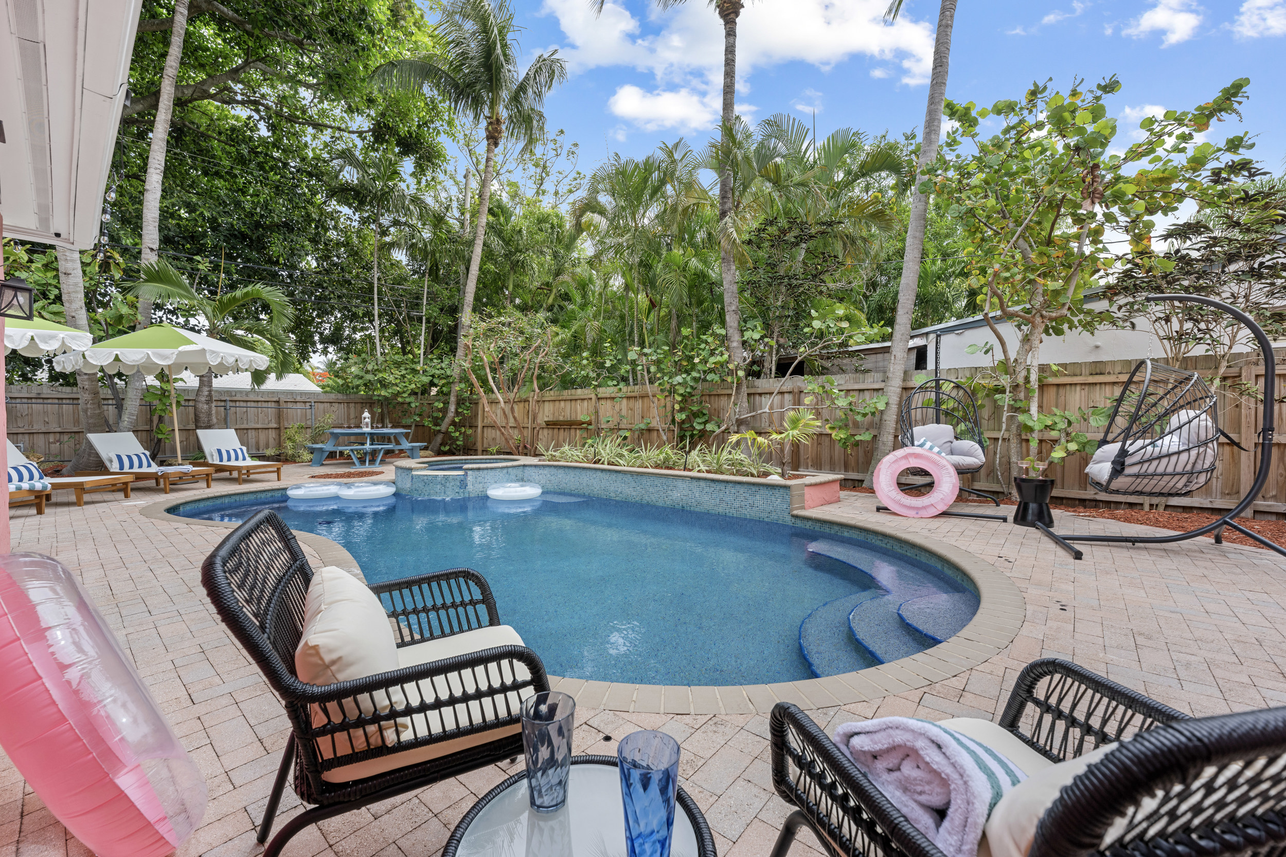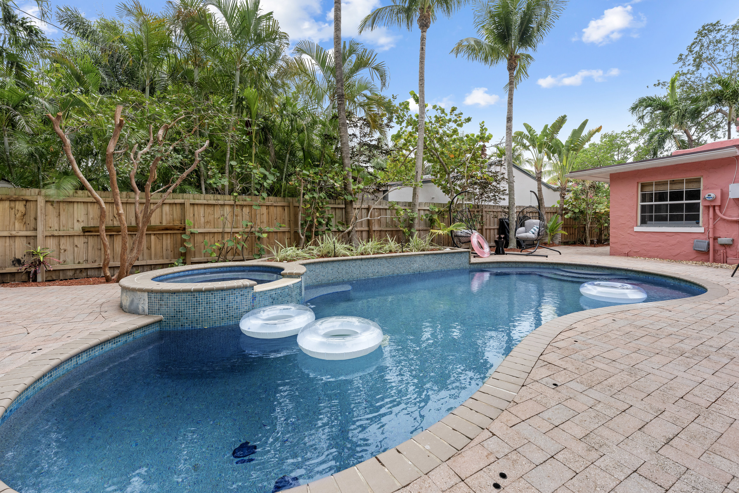 Step outside to a spacious, private backyard designed for both fun and ultimate relaxation. Lounge in the ample seating areas, enjoy meals al fresco with your loved ones, or gather around the fire pit on warm Florida evenings. The expansive yard offers plenty of space for kids and adults to play, unwind, or simply bask in the sunshine. Picture yourself starting the day with morning yoga, a casual game of catch, or soaking in the peaceful tropical surroundings.