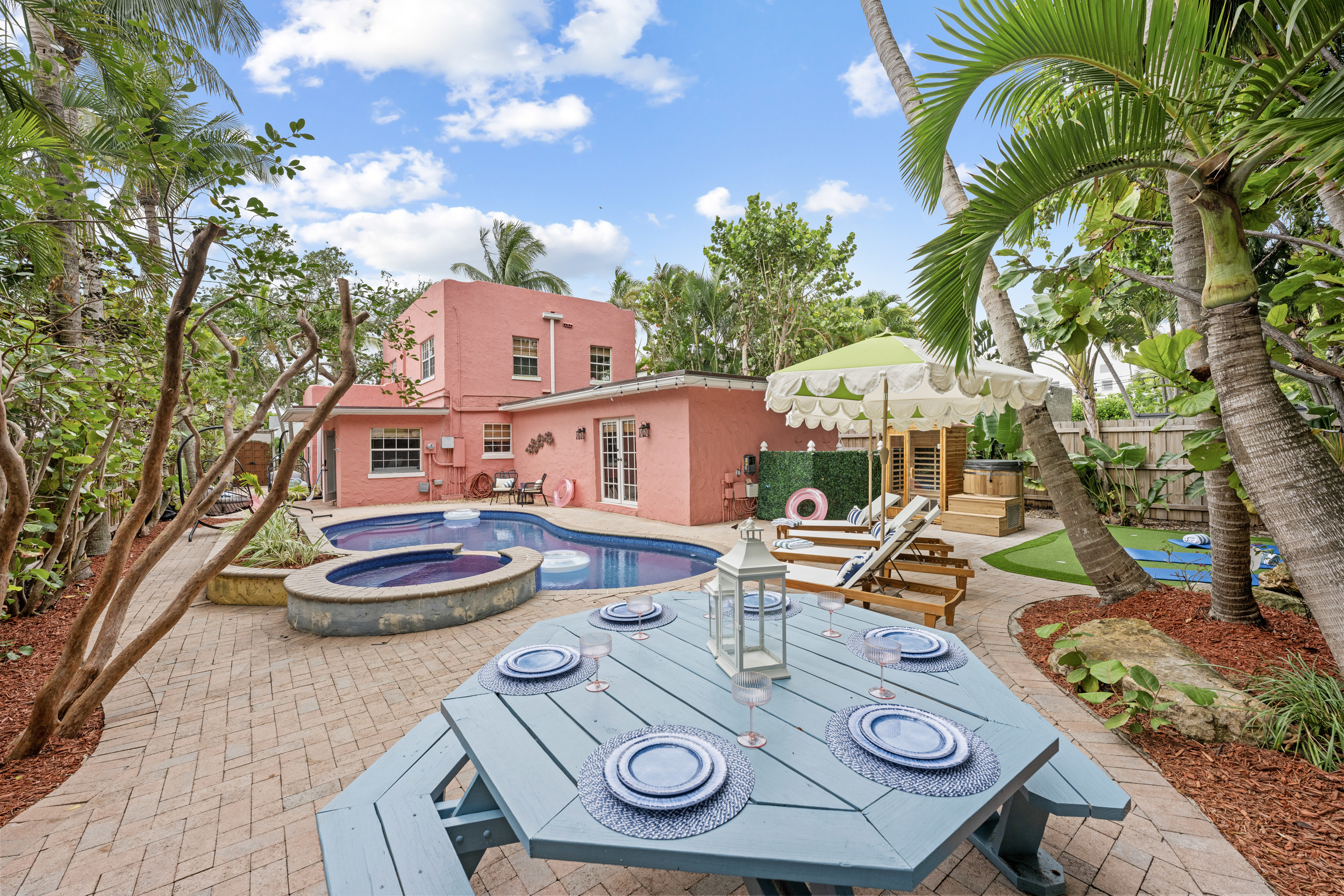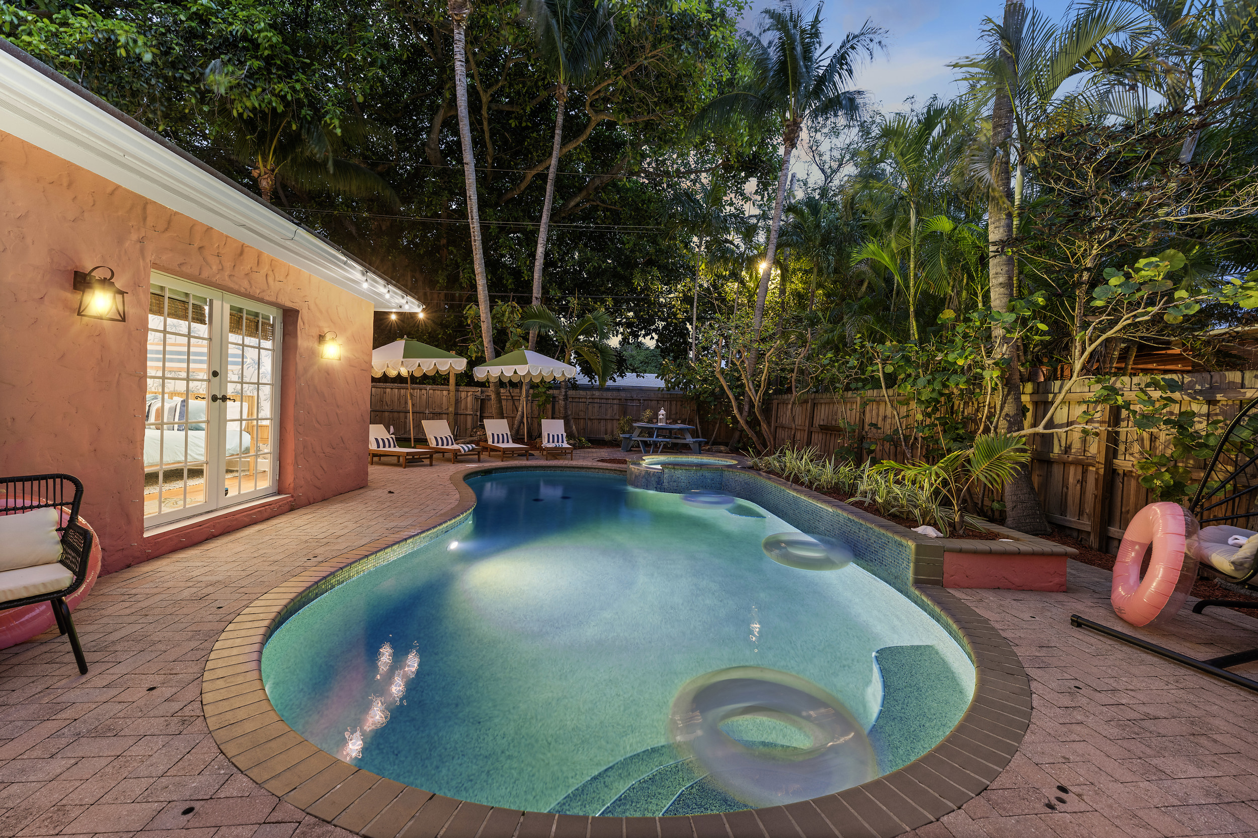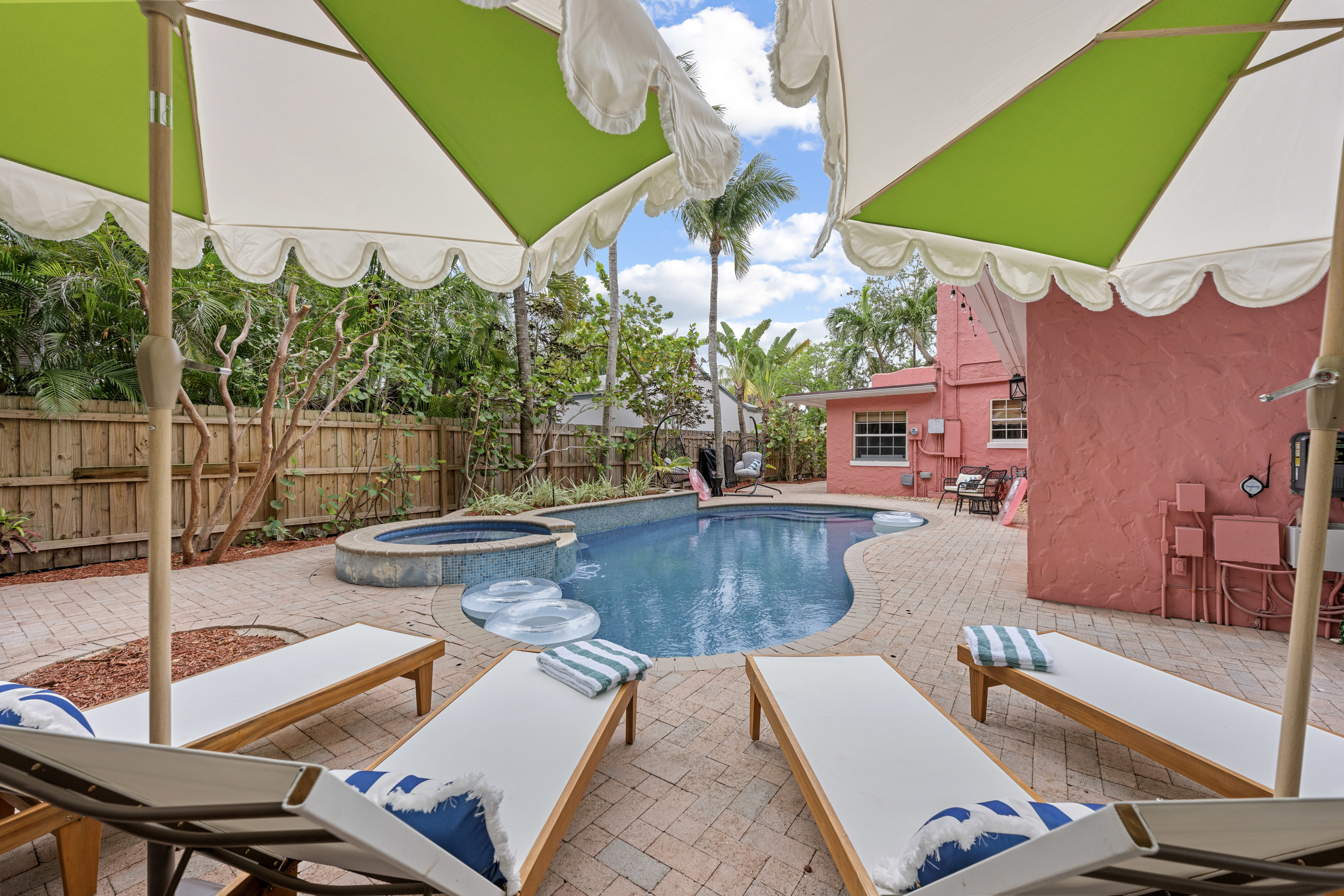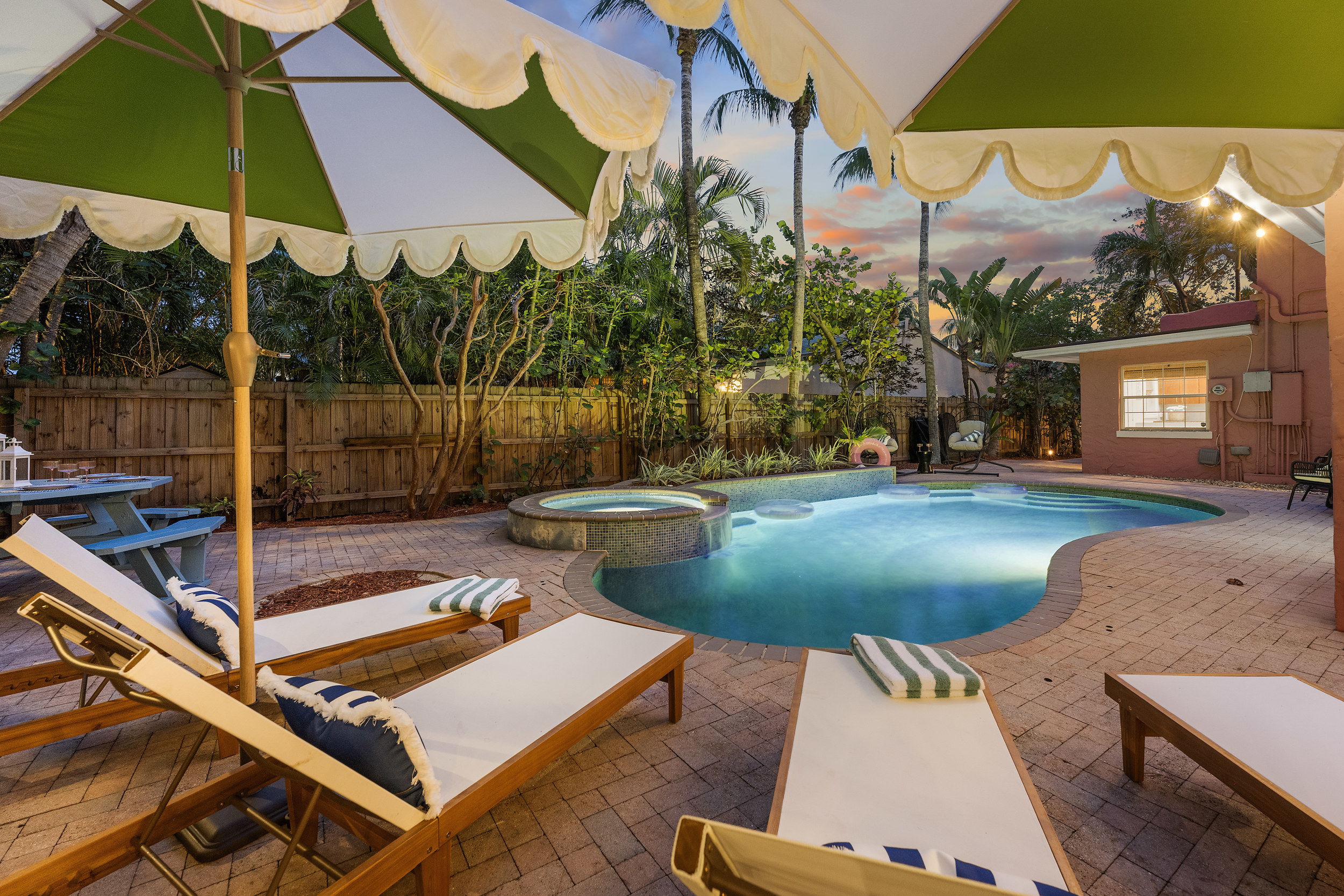 Step outside to a spacious, private backyard designed for both fun and ultimate relaxation. Lounge in the ample seating areas, enjoy meals al fresco with your loved ones, or gather around the fire pit on warm Florida evenings. The expansive yard offers plenty of space for kids and adults to play, unwind, or simply bask in the sunshine. Picture yourself starting the day with morning yoga, a casual game of catch, or soaking in the peaceful tropical surroundings.