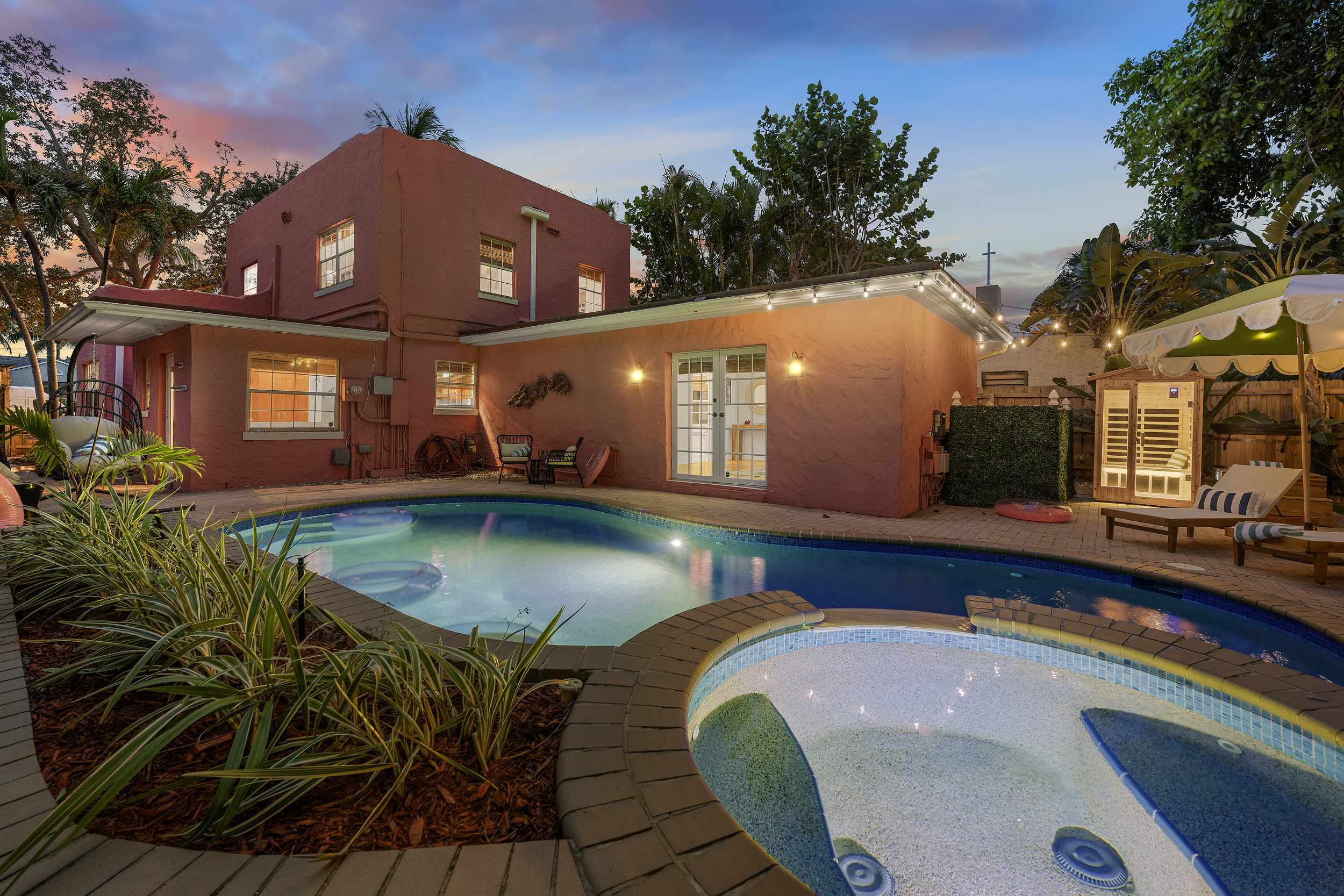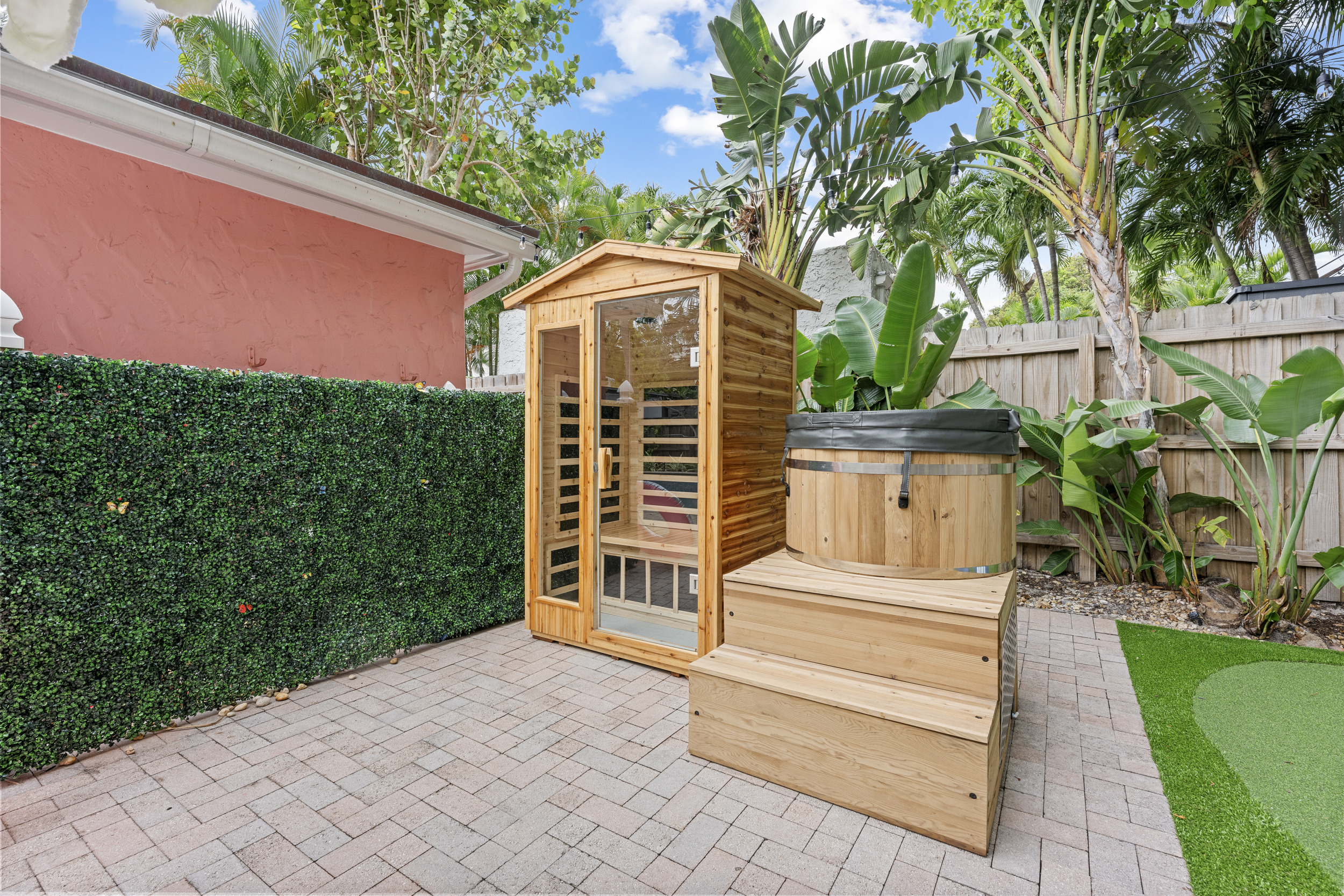 This vibrant backyard retreat is surrounded by lush greenery for privacy and features a tranquil in-ground SALTWATER pool with comfortable lounges perfect for soaking up the sun. For your wellness and comfort, enjoy the added luxury of a private sauna and invigorating cold plunge perfect for relaxing muscles after a swim or refreshing your body anytime.